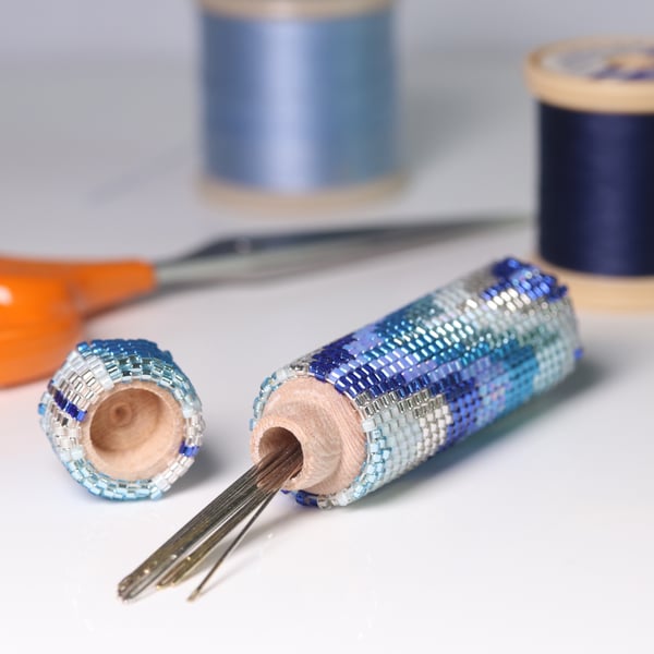 A gift for a needlework enthusiast, or maybe to treat yourself; here’s a useful tubular wooden case for storing your sewing needles. It will also help prevent accidental stabs when you are rummaging through your needlework supplies. The case has been covered with peyote beadwork; a vibrant design in shades of blue, silver and aquamarine. Measuring 6.4cm (2.5 inches) in length and 1.8cm (0.7 inches) in diameter, please be aware that some longer needles may not fit inside. A few needles have been included in the case. Your needlecase will be posted First Class, wrapped in acid-free tissue paper in a sturdy cardboard postage box. WHEN YOU BUY THIS ITEM £2 WILL BE DONATED TO TOYBOX, A CHARITY HELPING STREET CHILDREN ACROSS THE GLOBE. This amount is calculated by subtracting materials and admin costs from the price of the item. I do not charge for my time in making it.