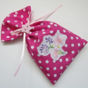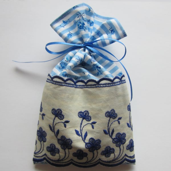 Lavender drawer sachet made from a blue and white striped floral fabric and decorated with a vintage embroidered flower design trim. It is filled with Suffolk lavender picked and prepared by me and tied with a blue ribbon bow. It measures 16.5 x 11 cm.