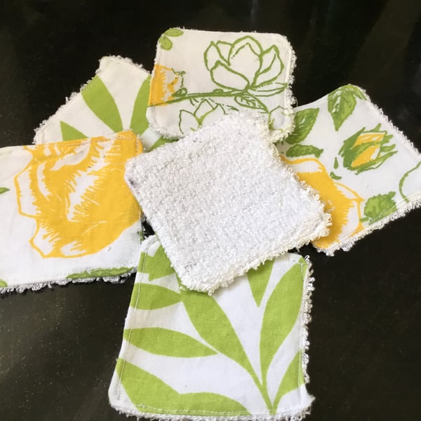 A pack of 6 reusable make up remover pads. The packs will vary slightly but have 3 leaf pattern and 3 flower pattern in shades of yellow, white and green. These each measure approximately 7cm square. The pattern is made from cotton material and the towelling side is white cotton towelling. These are also machine washable. Just use as normal make up remover pads then put into the washing machine.