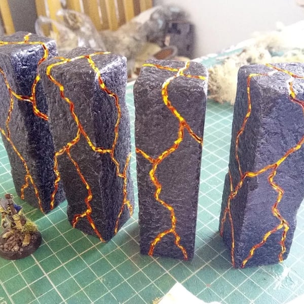 Set of 4 stunningly detailed handcrafted Lava pillars, brand new. This is an original piece of beautifully crafted scenery, comes painted exactly as you see in the pics. Each column is similar but unique. Approx size 100mm tall 30mm wide. Gloss varnished with a heavy weight in the bottom to stop them falling over if nudged. Ready to post via Royal Mail 48 hour tracked.